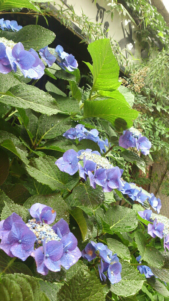 駅のホーム、線路の向こうにも紫陽花の群れ。